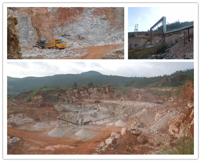 爆破后由挖掘機剝離礦石覆蓋物,利用裝載機將少量的廢石運輸至工業(yè)場地的平整和道路的修復(fù),礦石一部分通過裝載機鏟運運至破碎機受礦口,大塊的礦石通過挖掘機進行破碎后通過裝載機鏟運至破碎機受礦口進行破碎。
