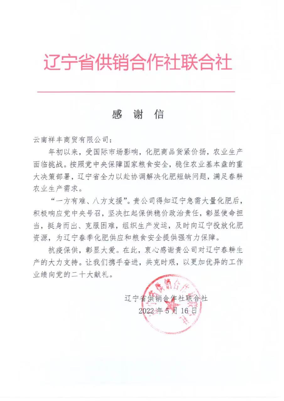 2022年5月16日,云南祥豐商貿(mào)有限公司收到一封來自遼寧省供銷合作社聯(lián)合社的感謝信,對云南祥豐商貿(mào)有限公司為遼寧春季化肥供應(yīng)和糧食安全提供強有力保障,大力支持遼寧春耕生產(chǎn)表示感謝。感謝信中指出,年初以來,受國際市場影響,化肥商品貨緊價揚,...