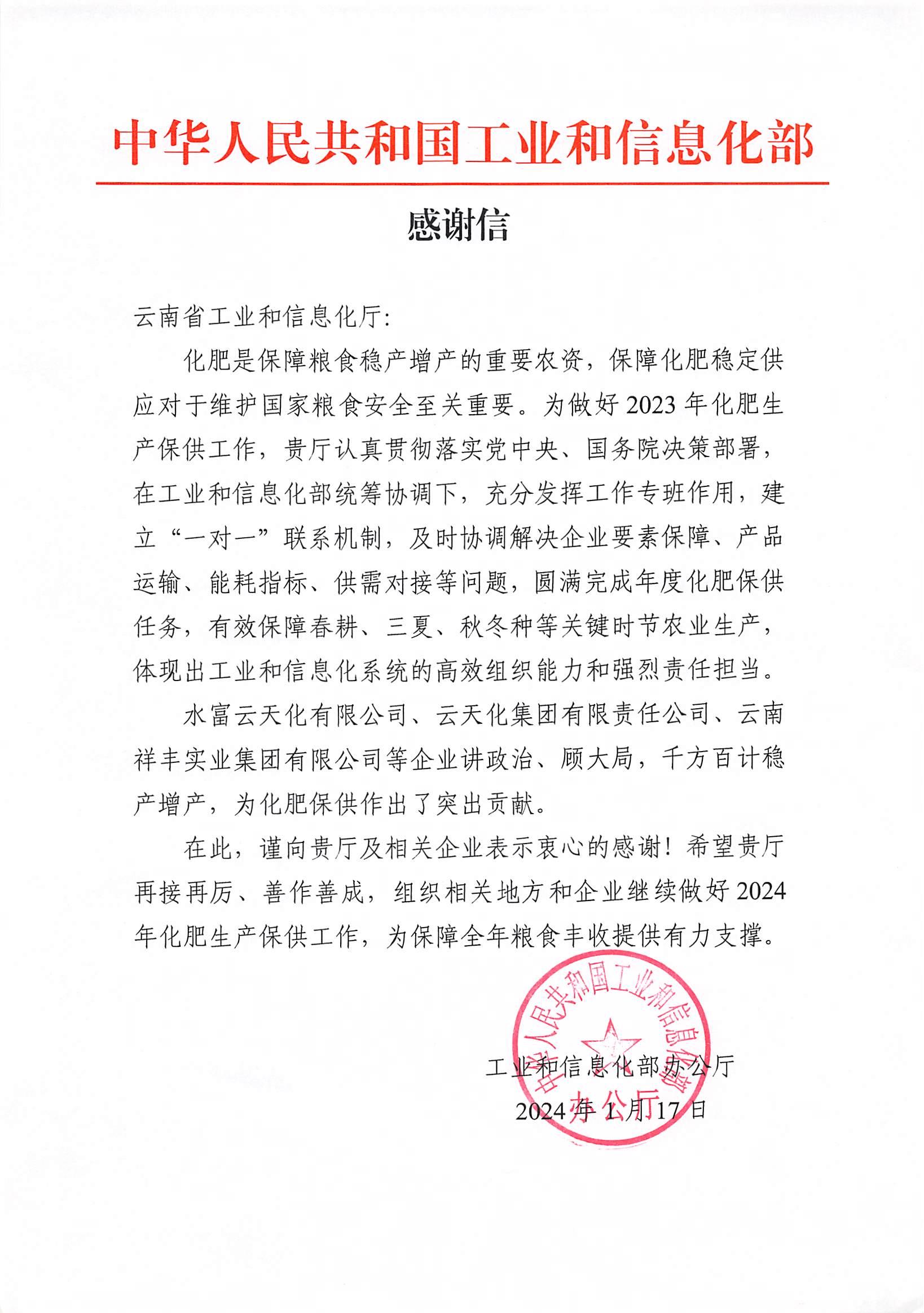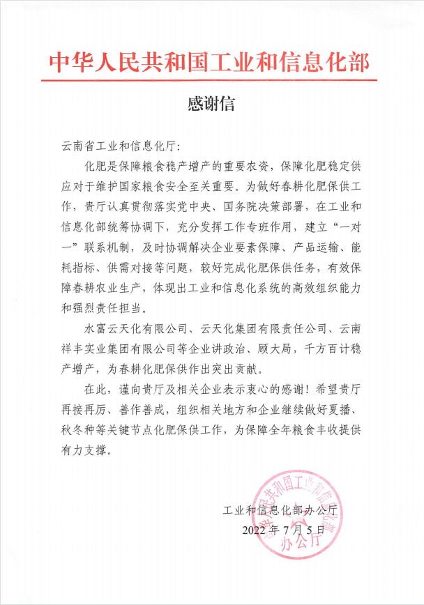 2022年7月5日,工業(yè)和信息化部發(fā)來感謝信,對云南祥豐實業(yè)集團有限公司講政治、顧大局,千方百計穩(wěn)產(chǎn)增產(chǎn),為春耕化肥保供作出突出貢獻表示衷心的感謝。感謝信中指出,化肥是保障糧食穩(wěn)產(chǎn)增產(chǎn)的重要農(nóng)資,保障化肥穩(wěn)定供應(yīng)對于維護國家糧食安全至關(guān)重要...