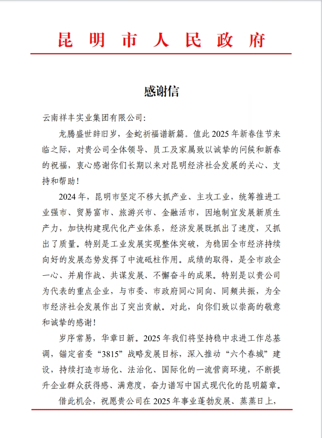 近日,昆明市人民政府向云南祥豐實業(yè)集團有限公司發(fā)來感謝信,信中指出:“云南祥豐實業(yè)集團有限公司等重點企業(yè),與市委、市政府同心同向、同頻共振,為全市經(jīng)濟社會發(fā)展作出了突出貢獻。希望貴公司一如既往支持昆明工業(yè)高質(zhì)量發(fā)展,繼續(xù)為全市經(jīng)濟社會發(fā)展做...