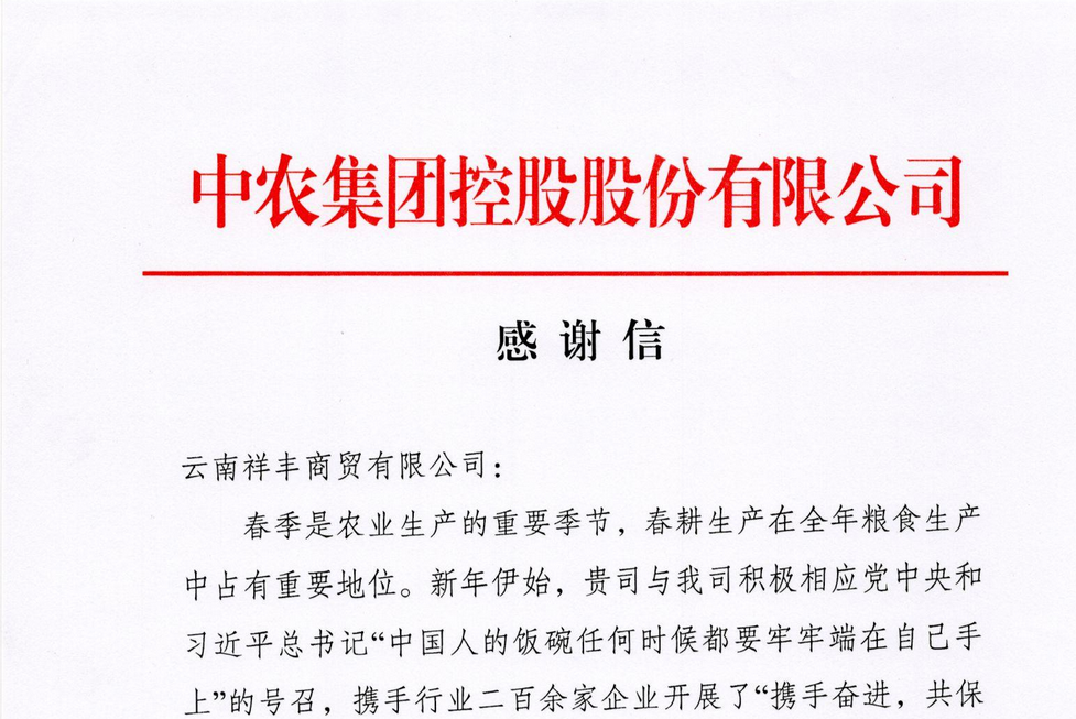 云南祥豐商貿(mào)有限公司收到中農(nóng)集團控股股份有限公司的一封感謝信
