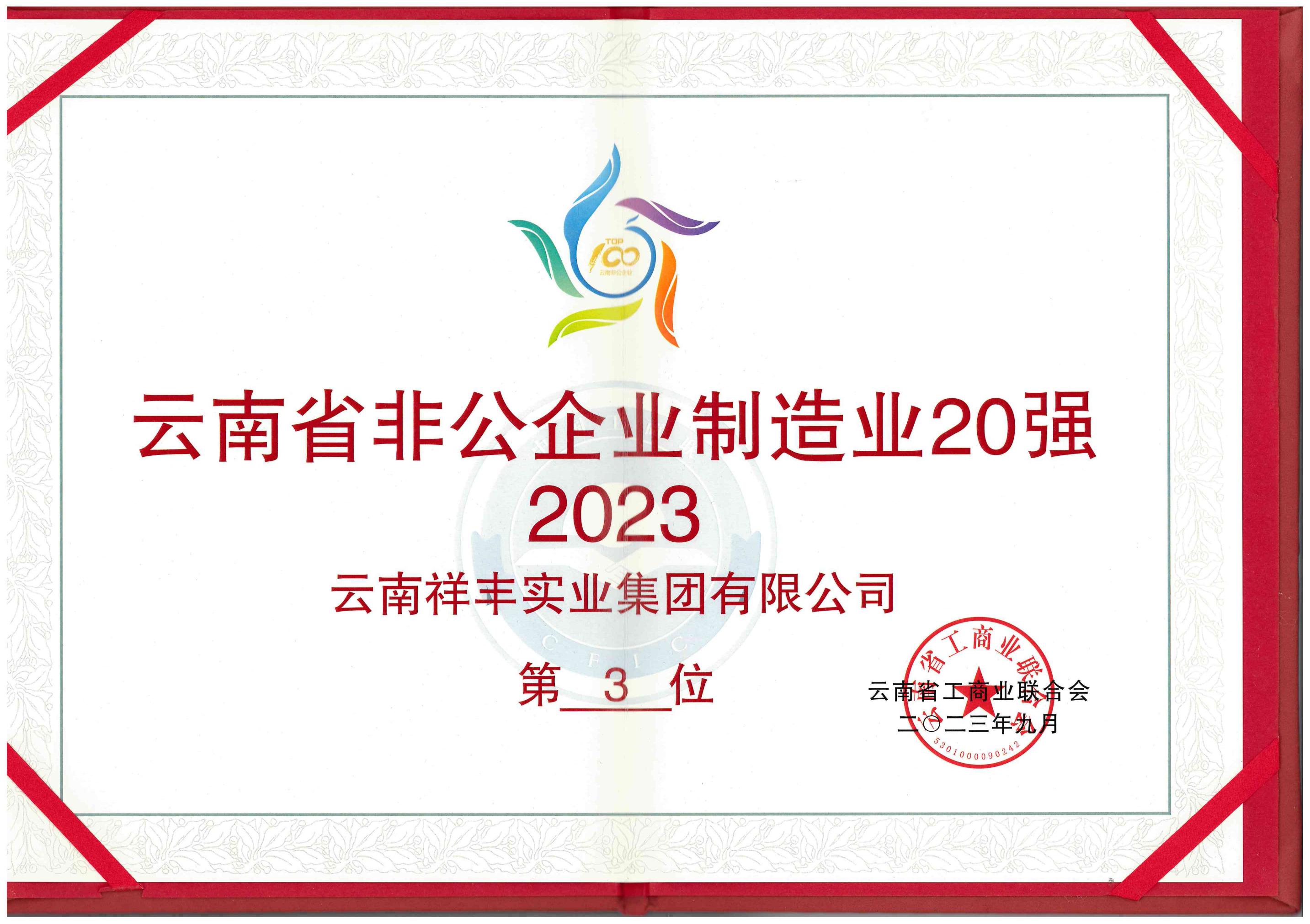 2023.9.2023云南省非公企業(yè)制造業(yè)20強(qiáng)(位列第3位)