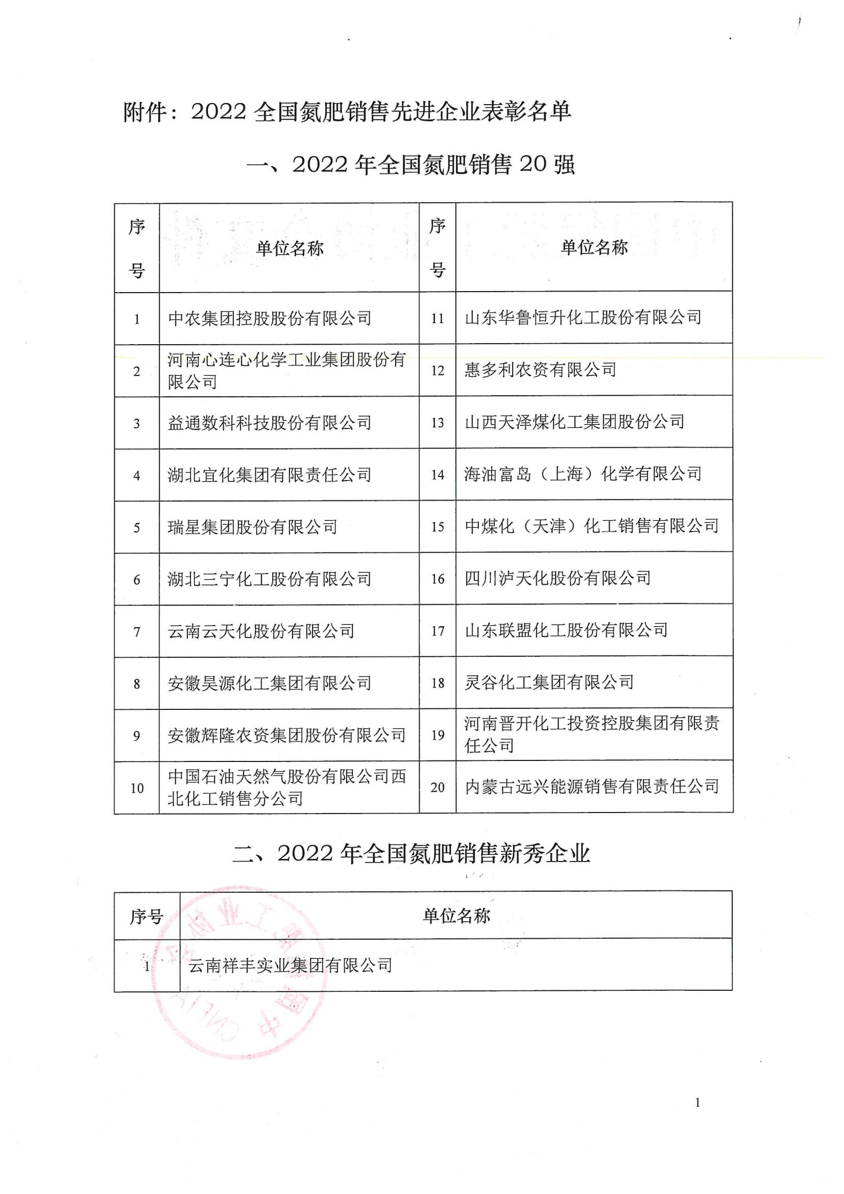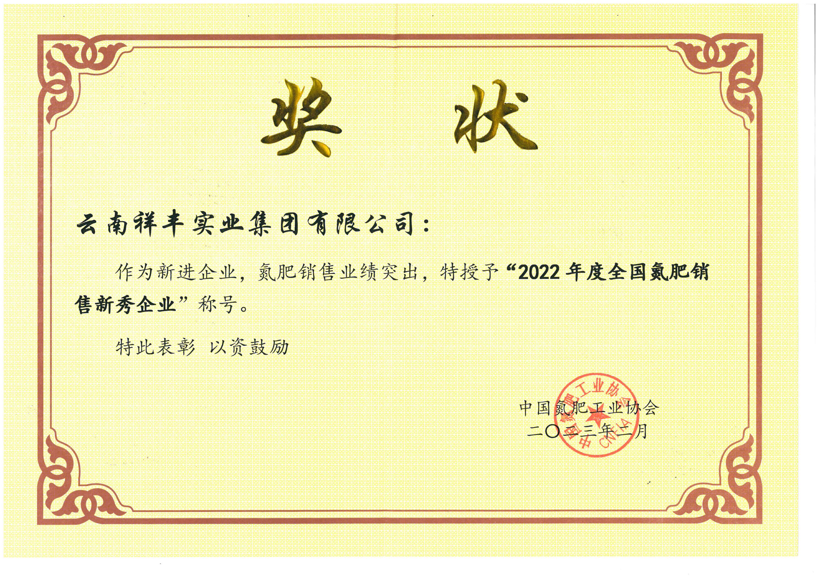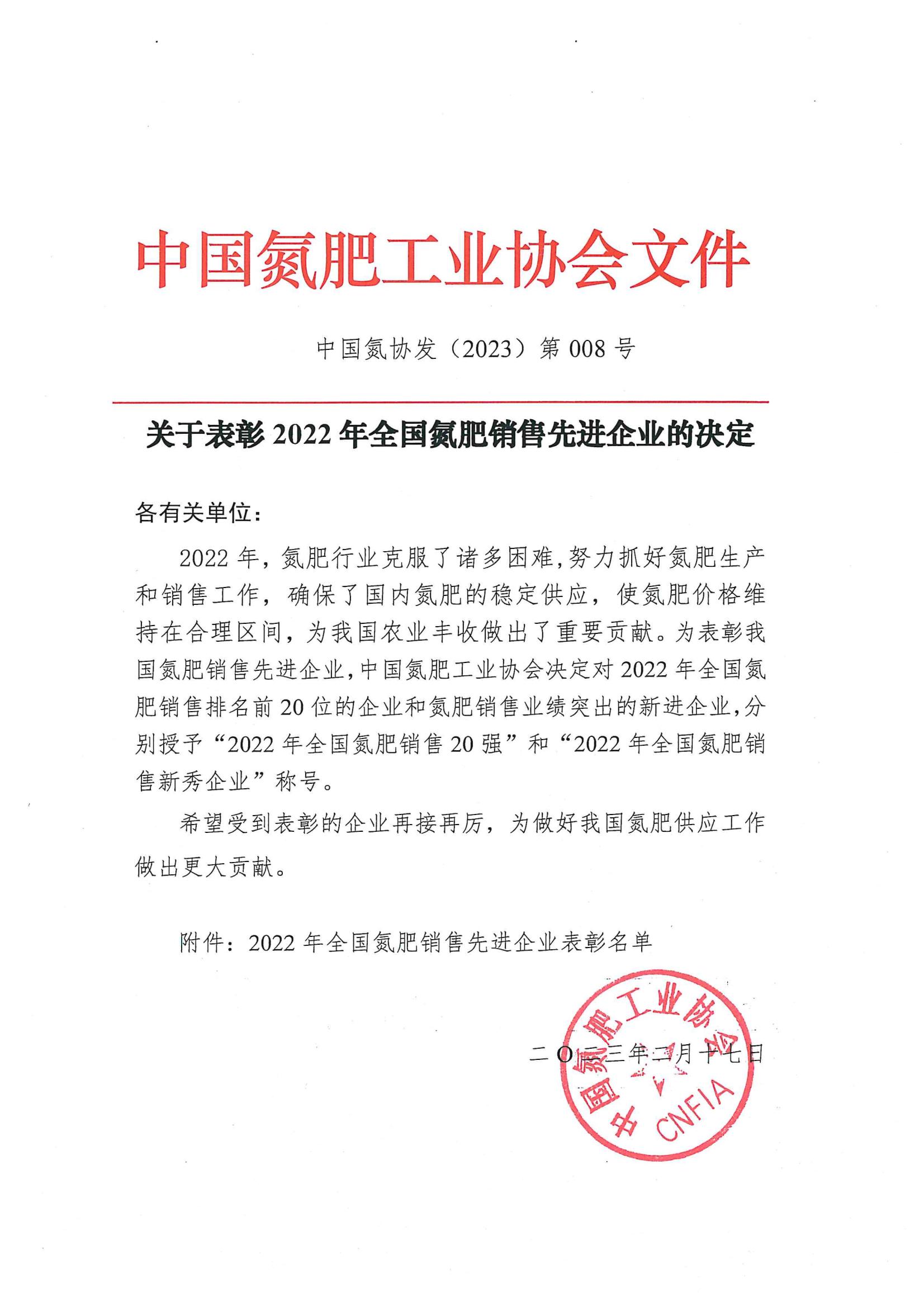 榮獲“2022年度全國氮肥銷售新秀企業(yè)”稱號
